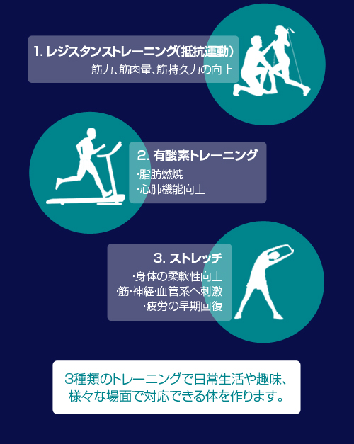 体への不安、悩みがありながら、なかなか時間が取れない方の為に3種類のトレーニングを1時間で行なえるプログラムを作りました。