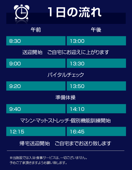 | 月曜日~金曜日・・・午後16:40~17:40(祝日営業) 土曜日・・・9:00~18:00 ※送迎車がご自宅まで伺います |